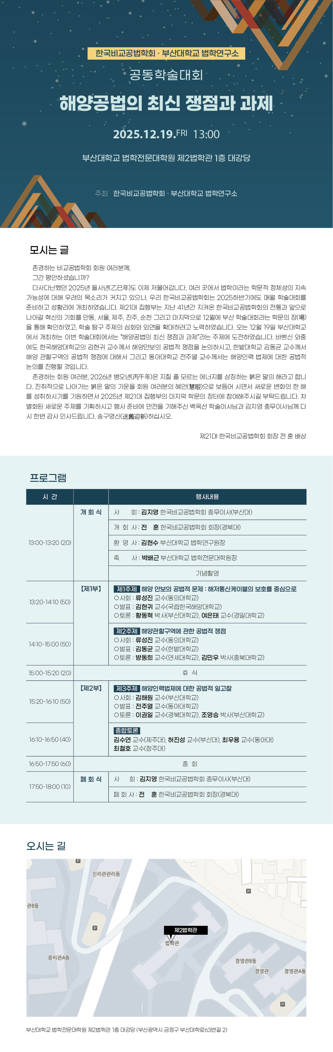 12¿ù 19ÀÏ ºÎ»ê´ëÇб³¿¡¼ °øµ¿À¸·Î °³ÃÖÇÏ´Â À̹ø Çмú´ëȸ´Â ¡°ÇØ¾ç°ø¹ýÀÇ ÃֽŠÀïÁ¡°ú °úÁ¦¡±¶ó´Â ÁÖÁ¦¿¡ µµÀüÇÏ¿´½À´Ï´Ù. ¹Ù»Ú½Å ¿ÍÁß¿¡µµ Çѱ¹Çؾç´ëÇб³ÀÇ ±èÇö±Í ±³¼ö²²¼ ÇØ¾ç¾Èº¸ÀÇ °ø¹ýÀû ÀïÁ¡À» ³íÀÇÇϽðí, Çѹç´ëÇб³ ±èµ¿±Õ ±³¼ö²²¼ ÇØ¾ç °üÇÒ±¸¿ªÀÇ °ø¹ýÀû ÀïÁ¡¿¡ ´ëÇØ¼ ±×¸®°í µ¿¾Æ´ëÇб³ ÀüÁÖ¿ ±³¼ö²²¼´Â ÇØ¾çÀη ¹ýÁ¦¿¡ ´ëÇÑ °ø¹ýÀû ³íÀǸ¦ ÁøÇàÇÒ °ÍÀÔ´Ï´Ù.